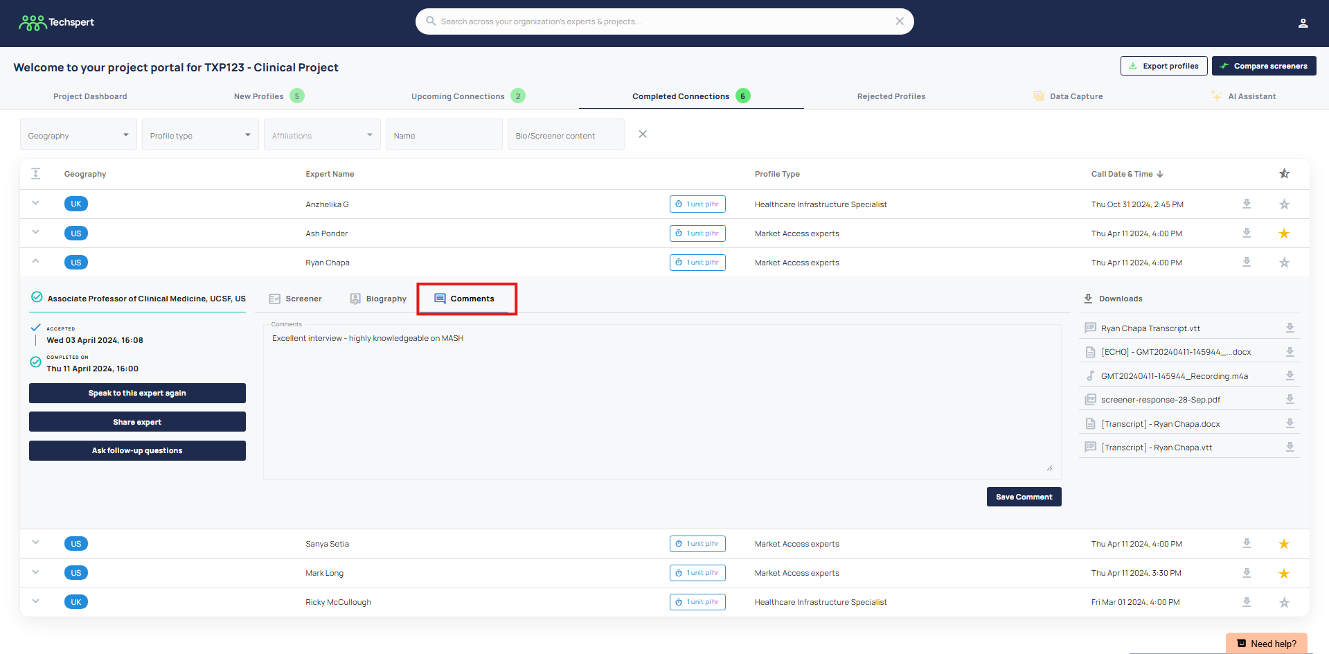 When you open an individual expert's record, click the “comments” tab to add a comment to that particular expert.