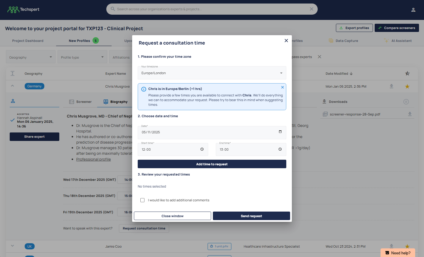 If the times shown on the platform don’t work for you, click “Request consultation time.” You’ll then be able to enter your preferred call times directly.