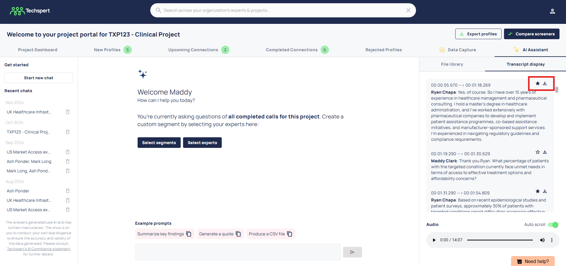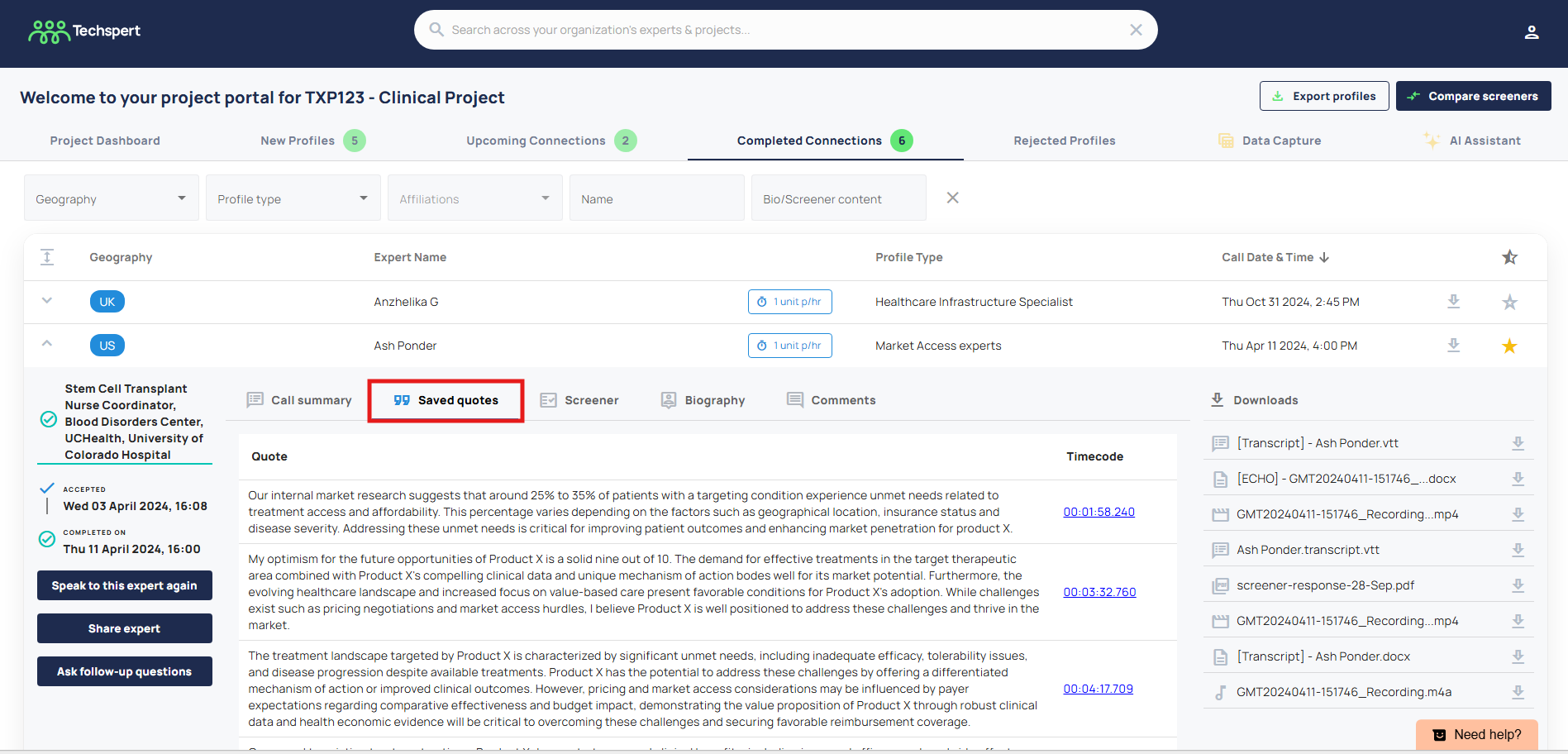 To retrieve these quotes, all you need to do is navigate to the completed connections tab, and under each expert you will see a ‘saved quotes’ section. Clicking the timestamp will take you back to the location in the transcript where the quote was sourced from.